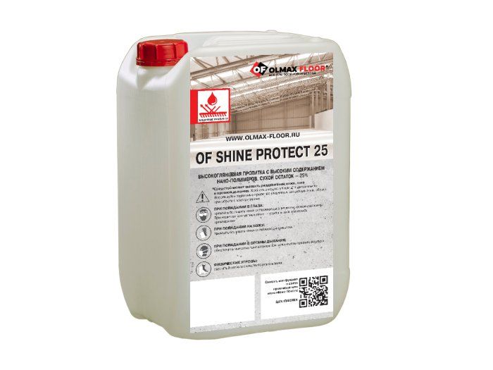 OF Shine Protect 25 (Шайн Протект 25) – литиевая, высокоглянцевая пропитка с повышенным содержанием нано-полимеров с высокой стойкостью к проникновению агрессивных сред, используемая для улучшения глянца, увеличения твердости, химической стойкости шлифованного и полированного бетона.